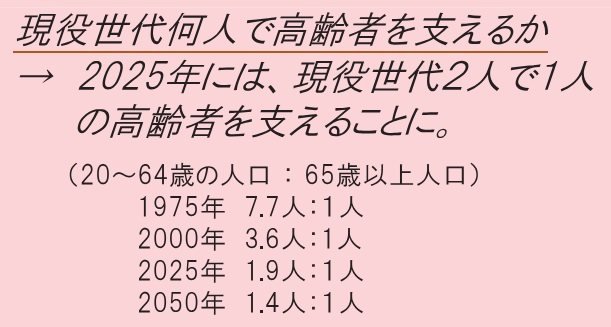 1960年には、現役世代11.2人で高齢者1人を支える計算でしたが、現在は現役世代2人で高齢者1人を支える状態になりました。